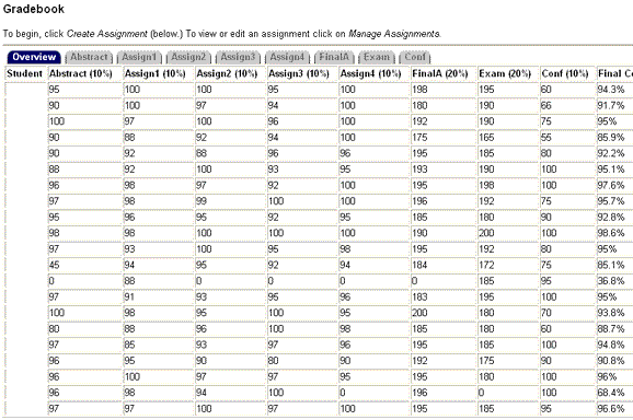 GradeBook appears only on the Instructor screen. It links student assignment folders into one table for grading Assignments replace GradeBook on the student screen. Students paste or attach assignments in this folder and receive grades and instructor comments. Chat Room can be scheduled by instructor or students as a place for real-time interaction. Class Members is a list of students, instructor, and assistants by name with links to individual or collective email accounts and bios. | |