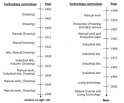 Table 1 for the three stages of curriculum: objectives, content, and implementation methods, a comparison can be found: the teaching goal is to follow the evolution of social changes and response measures derived from the use of skilled technical training tools, from the bottom of the inherent right to technology to realize the conservation of culture, the last to develop and adapt to society as the goal of fostering the capacity-building approach to target the needs of today's social scientific and technological personnel, but also significant considerations tend to solve problems, curriculum change and social development of technological process to each other.