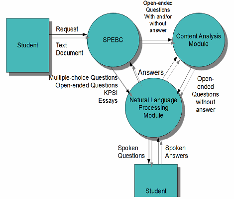 The second scenario is interaction between the student and LISTENER. The learner talks with the interface to answer an open-ended question, to dictate an essay, or just to think aloud expressing ideas about a given topic (See Figure 1). And LISTENER will help learners to complete an answer or essay or clarify their ideas through generation of questions. The third scenario will support collaborative work among students and LISTENER. One computer with an internet connection will be required for each student. Students will be able to establish a connection from anywhere they are to the classroom or to any other place. Students will able to ask LISTENER to function as the discussion moderator. LISTENER will generate questions about the text documents given as an input or about the conversations among students. Furthermore, each student will be able to use LISTENER as explained in the second scenario so learners will be able to share with other students the personal feedback given to him or her. Moreover, LISTENER will save a record of the discussion and this will be available s text or audio. It will be necessary to implement a specific web application that facilitates collaborative work among students and LISTENER. The Architecture of LISTENERThe software to be included in LISTENER consists of SPEBC, content analysis module and the natural language processing modules. A brief description of each module is given below: SPEBC