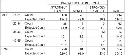 DiscussionModern ICTs has to do with the convergence of computer technology and telecommunication technology. From the literature review, it was determined that the Internet is the information superhighway, a global network of networks connecting millions of computers. Today, the internet is the most technologically advanced medium of communication. It shares digital information through a common set of networking and software protocols (Muciano and Kennedy, 2002, Nsude 2004). The Internet is a major driver of the globalized world in the 21st century. It has also claimed to have the immense ability to change societies. This study set out to examine the influence of the internet on academic performance by analyzing the relationship between critical variables. Results for each hypothesis were as follows: H1: There will be significant relationship between Internet usage and the sex of the respondents. An analysis on gender and the frequent use of the Internet supported the hypothesis as stated. Chi Square analysis on Table 3a, b and c revealed there was a relationship between variables, but the relationship was a weak one. Results from the Chi Square tests were significant at the 5% alpha level. Table 3b and 3c help to determine the strength and direction between variables i.e. the approximate significance value has 0.00 in its column; one can infer there was a relationship between the variables. In addition, the value statistics helps to determine the strength or the direction of the relationship, it can range from -1 to 1 i.e. negative value indicates a negative relationship, and positive values indicate a positive relationship. From table 3b and c, the relationship between variables is a weak one. With regards an analysis of age and knowledge of the internet. The hypothesis was upheld. From the available data on table 4a, b and c, the hypothesis was accepted because the asymmetrical values in the Chi Square test were less than 0.05. H2: There will be significant relationship between Internet knowledge and age of the respondents. Table 4 b and 4c reveal a positive and strong relationship between variables. This hypothesis focused the significant relationship between frequent use of internet and academic performance. This result supports the assertions of Ribisi (2001) study, whereby he asserted that by the age of 10, young people are more likely to use the internet than adults at any age beyond 25. Nearly, two-third (65.4%) of 10-13 year old and more than three quarter (75.6%) of 14-17 year old use the internet. H3: There will be significant relationship between Internet usage and the academic performance of the respondents. This hypothesis was upheld as revealed in tables 5a, 5b and 5c. Table 5a indicated the chi square test with a significance value less than 0.05. This indicates there may be some relationship between the two variables. In this case, there is an asymmetrical value of .000 which is less than 0.05, which means there is a form of relationship at a degree of freedom (df) of 6 with a linear by linear association of 37.338. Tables 5b and 5c indicate that the relationship among the variables is a positive and strong relationship. H4: There will be significant relationship between Internet knowledge and the academic performance of the respondents The fourth hypothesis tested the relationship between the knowledge of the internet and academic performance. The data in tables 6a, 6b and 6c confirmed the hypothesis with asymmetrical values in the Chi Square test less than 0.05. Tables 6 b and c reveal that the relationship between variables is a positive and strong relationship. Recommendations and ConclusionsThis study reveals that the internet is an important resource for manpower development as well as educational performance and research. In addition, efforts need to be made to ensure that universities and school of higher learning are ICT driven. In essence, if students and scholars have access to the internet, academic performance is generated. The government must improve the Information and Technology as the educational sector for manpower performance and skill acquisition. In essence, the Internet can effectively contribute to educational advancement rather than obstruct it. Some pre- conditions must been met, such as the provision of infrastructure with provision of subsidized internet subscription and training for students, scholars and researchers. African countries can emulate the positive gains of countries like United Kingdom, Malaysia, and United States of America, among others, where open and free access to the internet is having a significant impact on the quality of education and training. Access to the Internet will encourage computer literacy and educational development in African countries. ReferencesAdaja, T. (2005). Communication and Strategies for Effective Communication . Journal of Communication and Society, 4, 33-48. Agba, P. (2002). New Communication Technologies in Broadcasting for Enhancing Development. Nigerian Journal of Communication. Amodu, L. (2008). The role of the internet in the sustainable development in rural Africa: A fact or a farce. In Soola, E.O. (Ed), Health communication, gender violence and ICTs in Nigeria (pp. 285-296). Ibadan: Ibadan University Press. Barak, A. & Fisher, W. (2001). Towards an internet driven, theoretical based, innovative approach to sex education. Journal of Sex Research, 38(4), 324-332. Cambell, R.(1998). Media and Culture: An Introduction to Mass Communication. Newyork: St Martin Press. Defleur, L & Dennis, E.(1988). Understanding Mass Communication. Boston: Houghton Miffin Company. Farnham, D. (1999). Managing in the Business Context. Institute of Personnel Management. Folarin, B.(1998).Theories of Mass Communication.Ibadan, Nigeria.Sceptre Publishing ltd Heisse, D & Grandgenette, N.(1996). Perspectives on the use of internet in Art classroom. Art Education, 49 (6), 12-16. Kombol, M. (2006). An Assessment of the P