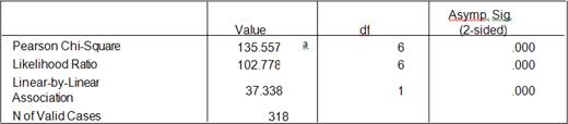 Chi-Square Tests | Value | dl | Asymp. Sig (2-sided) | Pearson Chi-Square | 80.577a | 3 | .000 | Likelihood Ratio | 97.511 | 3 | .000 | Linear-by-Linear Association | 68.453 | 1 | .000 | N of Valid Cases | 304 | | |