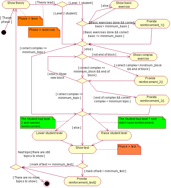 During steps (2) and (3), if the student does not obtain the minimum scores fixed for the topic, he gets reinforcement in order to reach the objectives for the course. In activity “Provide reinforcement_1” of Figure 3, the system selects a basic exercise not well solved gets reinforcement material based on previous topics studied. This way the system helps the student to correctly solve the basic exercise. After proposing the reinforcement material, and before the student has to solve again the basic exercise, the ITS shows the bad response that the student gave previously. When the student passes the minimum score, the system does not go on providing reinforcement. Ins the worst situation where system provided reinforcement to all basic exercises that were badly answered and the student has not been able to solve them, the ITS tells the student to consult the tutor personally. After this meeting the student is permitted to advance in the study of the course. In activity “Provide reinforcement_2” learners are reinforced during solving of complex exercises. The strategy for providing reinforcement to the student in complex exercises is similar to the reinforcement strategy for basic exercises. The only difference is that the ITS firstly tries to reinforce with material of the current topic; and, if the student is still not able to solve the complex exercise, he is reinforced by material from previous topics in the course. If the student has not seen all selected complex exercises, he will only receive reinforcement for exercises offered in the last block of complex exercises. If he already attempted all complex exercises blocks, he will be reinforced for all complex exercises incorrectly solved and not previously reinforced.