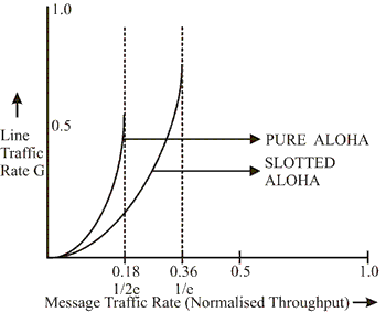 8.2.1 Pure Aloha. In the simplest form, also called pure or unslotted Aloha. Stations transmit packets randomly and packets from different stations may collide. Stations retransmit the packets until they are received correctly. To avoid repeated overlaps, time interval of packet transmission is randomised. Prof. Abramsan and others gave analysis of the Aloha channel throughput [4,7] in term of traffic offered as S = Ge-2G where S is the average no. of packets transmitted successfully and G is the average no. of packet attempted to be transmitted.
