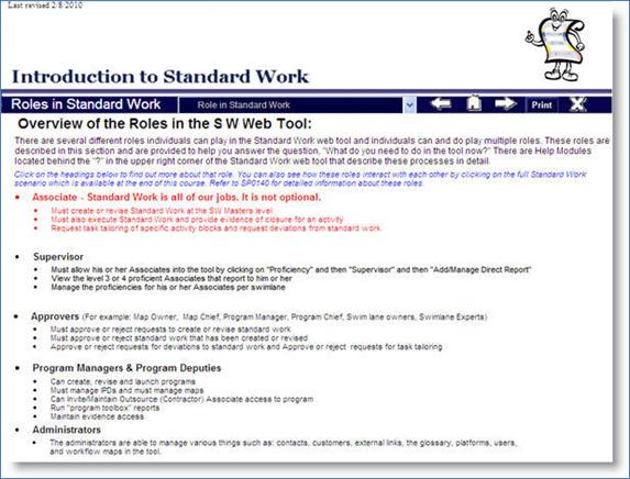 Figure 3Best Practice from Literature Review: An adult’s readiness to learn is related to his or her social role (Merriam et al. 2007). How was it implemented in this course? The course has been implemented as a prerequisite to gaining access to the enterprise-wide application that many employees need to do their jobs correctly. This seems as if it may be counter-intuitive to one of the principals of adult learning, which is the internal motivation described by Merriam et al. (2007) while describing Knowles model of andragogy, and to an extent it is. Since this initiative was driven by senior management to meet a business need, internal motivation is not really a factor in this situation. The course also speaks to the specific roles users can have in the tool and information is presented specifically to that role. See Figure 4. Best Practice from Literature Review: Adults learn best when attempting to solve problems and apply training to a real life situation. (Merriam et al. 2007). How was it implemented in this course? The course does this in several ways. It shares success stories of how others have implemented the tool in order to make a positive business difference. (Figure 5). It also gives the learners step by step instructions regarding the actual physical use of the tool (i.e. it shows the learner which buttons to click once he or she is in the tool. (Figure 6).